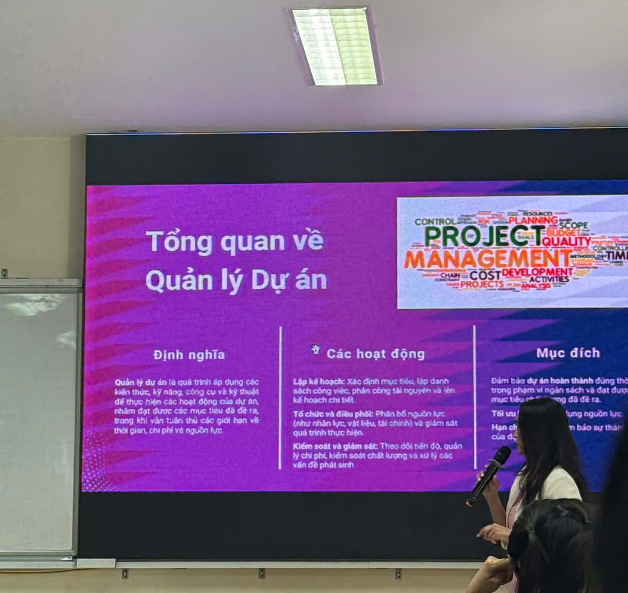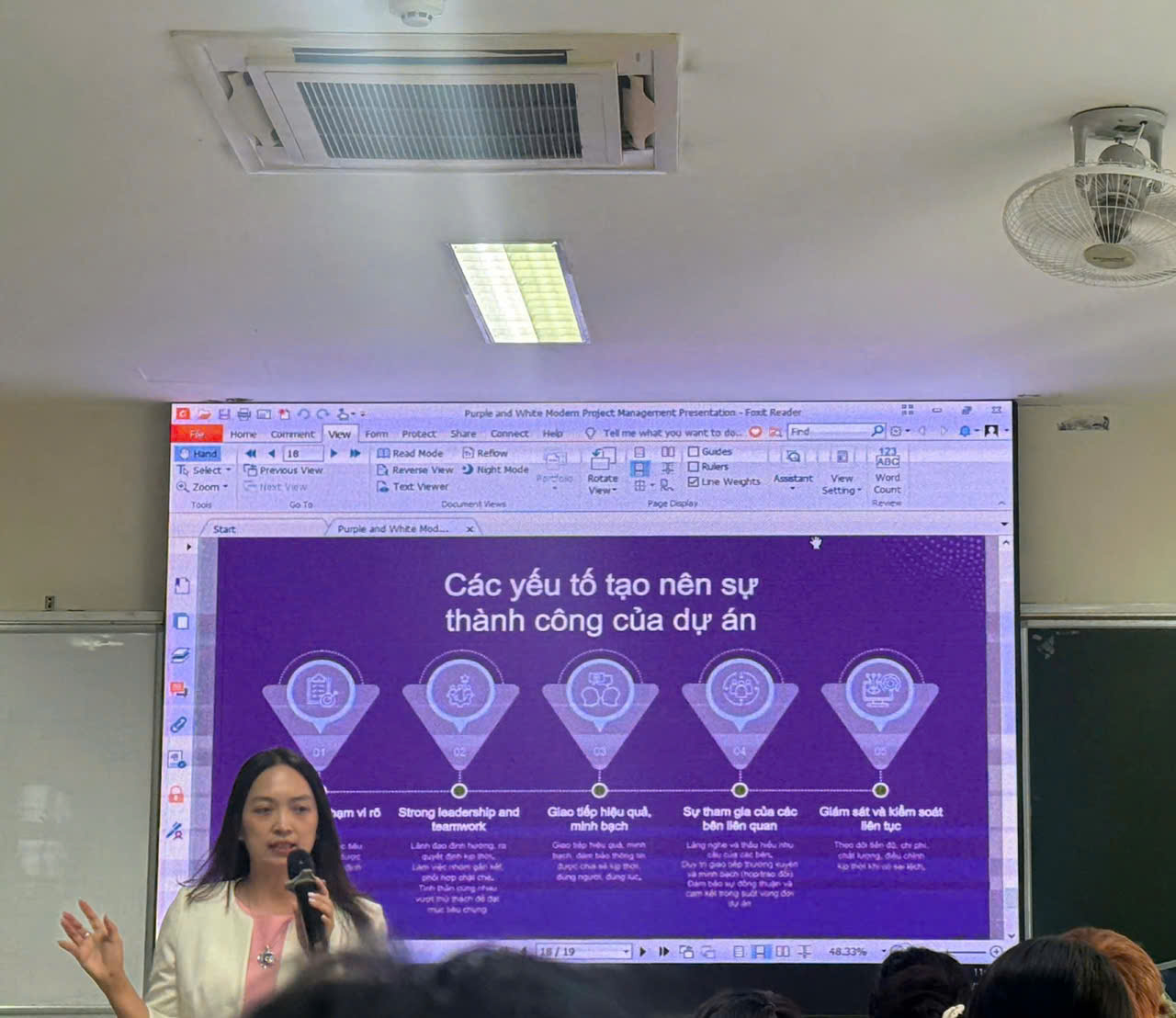 Buổi chia sẻ diễn ra trong không khí vô cùng sôi nổi, vui tươi. Chị Quỳnh Anh đã nhiệt tình giải đáp các câu hỏi về vấn đề thường gặp của sinh viên, đồng thời chia sẻ thêm về cơ hội nghề nghiệp, định hướng phát triển và kinh nghiệm làm việc tại các tập đoàn lớn đến tập thể lớp. Buổi chia sẻ không chỉ mang đến kiến thức thực tế chuyên sâu về quản lí dự án mà còn trang bị cho sinh viên tư duy và các bộ kĩ năng cần thiết để tự tin tham gia các dự án trong tương lai.