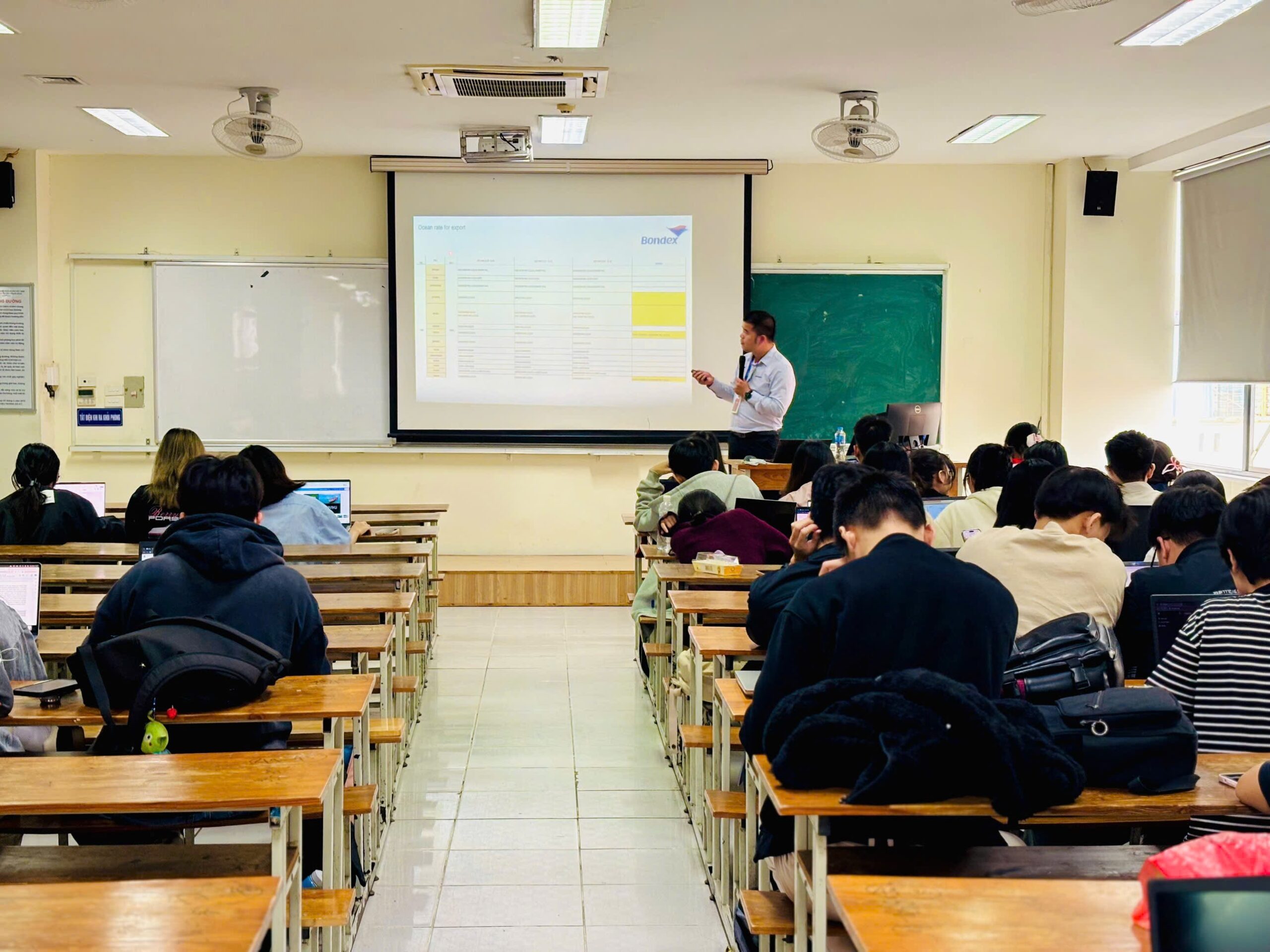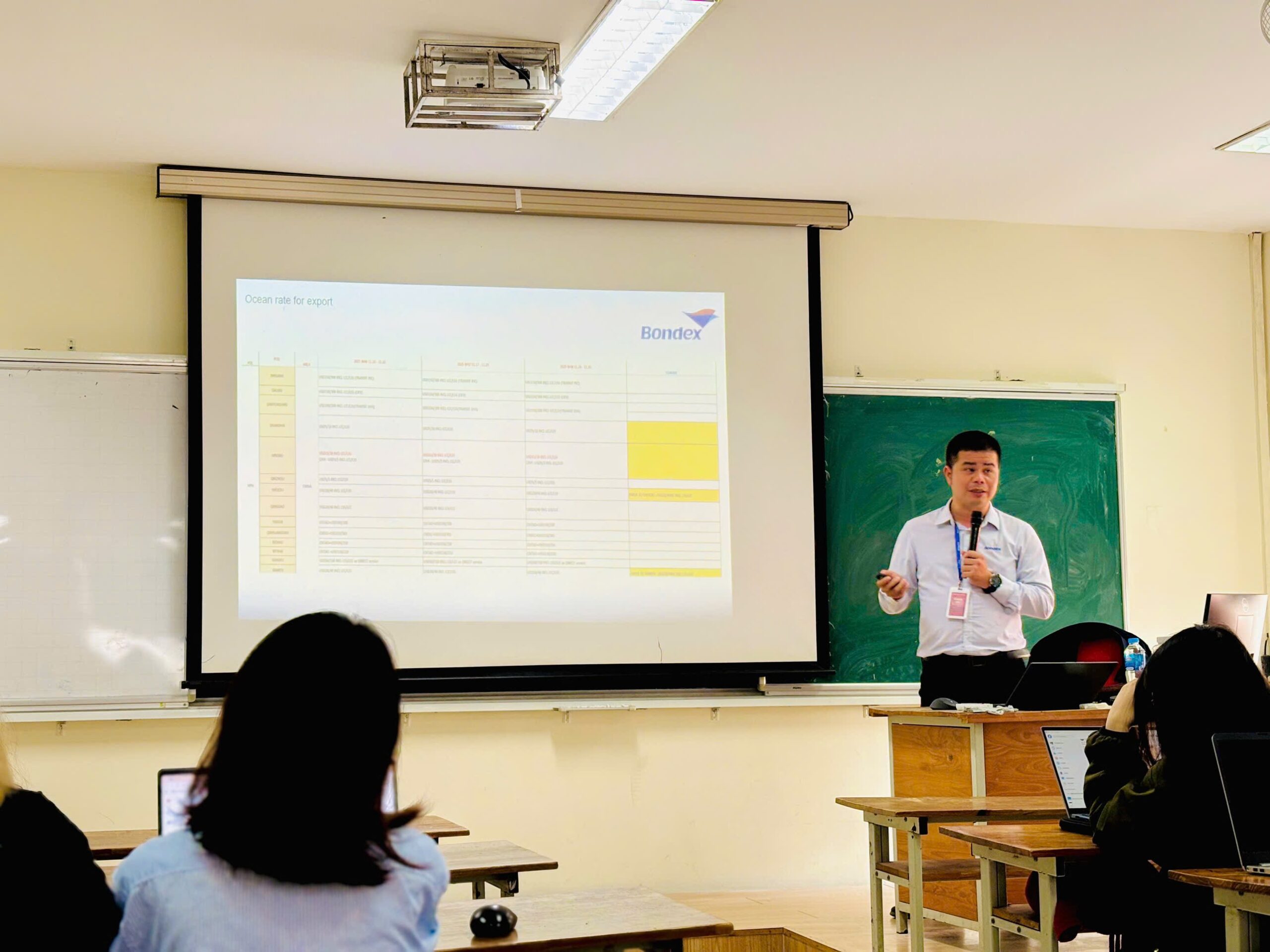 Ngày 02/12/2025, lớp Logistics và vận tải quốc tế (TMAE336(2526.1-GD2).1) đã có cơ hội tham gia buổi học co-teaching trực tiếp với chủ đề “Thực tiễn logistics và vận tải quốc tế trong bối cảnh chuỗi cung ứng toàn cầu biến động”. Chương trình có sự tham gia của chuyên gia Nguyễn Đình Vượng – Phó Giám đốc Chi nhánh Công ty TNHH SITC Bondex Vietnam Logistics, cùng sự đồng hành của TS. Hoàng Thị Đoan Trang – giảng viên môn Logistics và vận tải quốc tế, Viện Kinh tế & Kinh doanh quốc tế, Trường Đại học Ngoại thương.