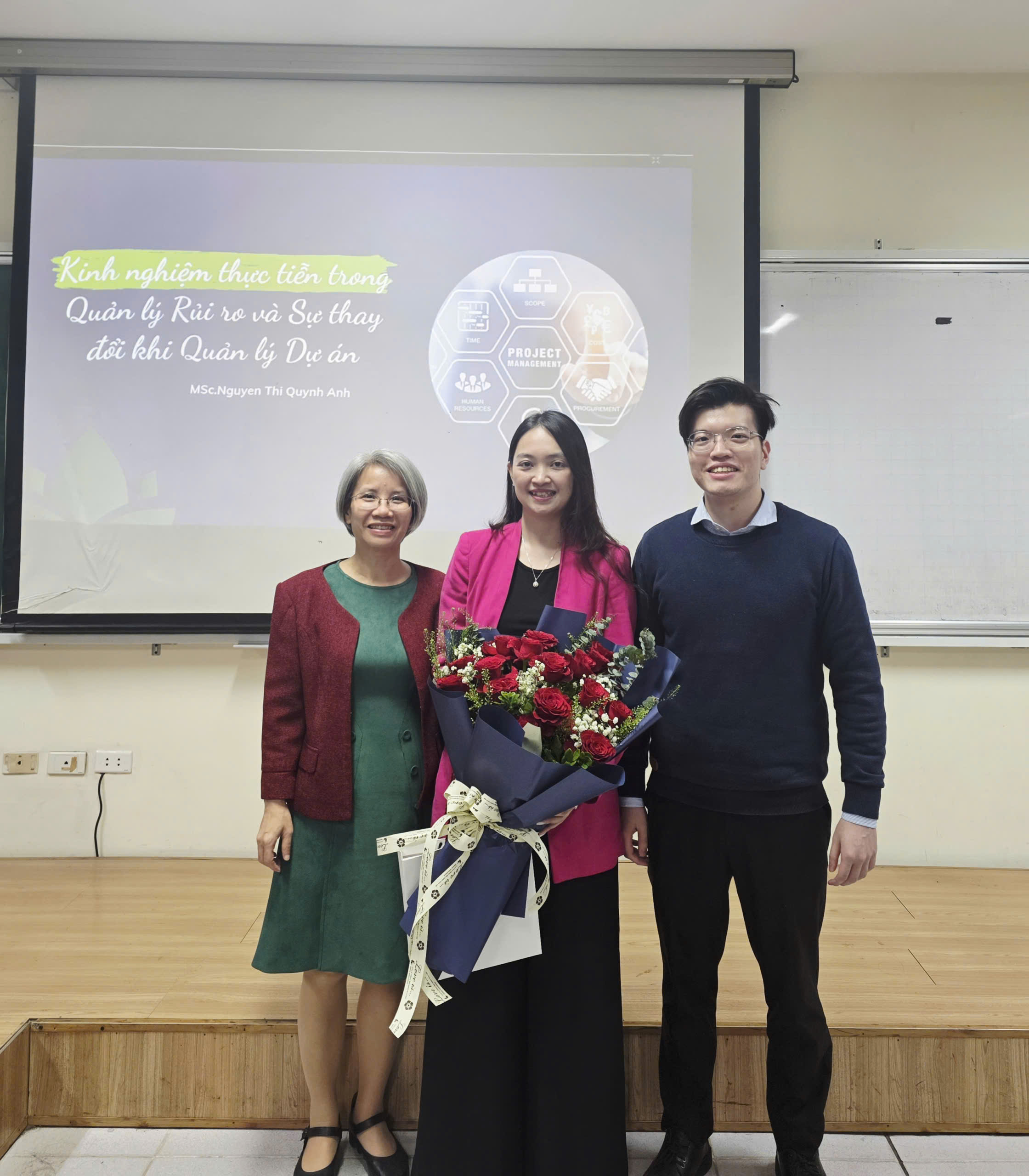 Ngày 28/11/2025, lớp Thạc sĩ Quản lý kinh tế 7A của Viện Kinh tế và Kinh doanh quốc tế – Trường Đại học Ngoại thương đã hân hạnh đón bà Nguyễn Thị Quỳnh Anh tới giao lưu và chia sẻ những trải nghiệm thực tiễn về quản lý rủi ro và sự thay đổi trong học phần Quản lý dự án.