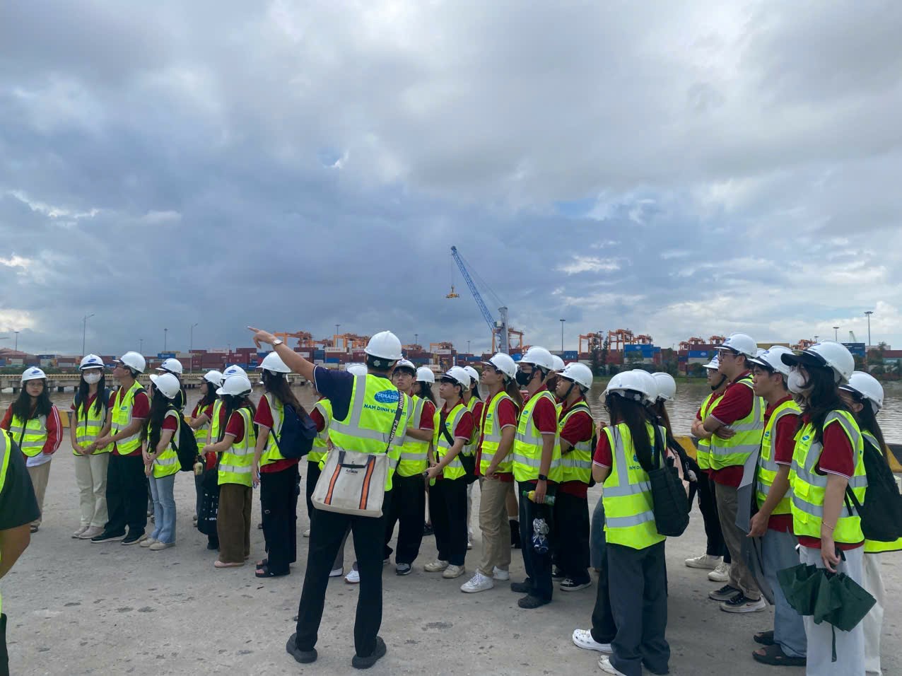 Trong chuyến tham quan, đoàn sinh viên được anh Đoàn Hữu Nam cùng các cán bộ kỹ thuật – thương vụ của cảng giới thiệu chi tiết về các bộ phận trong cảng, thông số kỹ thuật của tàu container, cầu cảng, hệ thống cẩu container, cùng các quy trình và thủ tục xuất nhập khẩu đường biển. Tại khu vực cầu cảng, các sinh viên được trực tiếp quan sát hoạt động bốc dỡ container, vận hành cần cẩu giàn, xe đầu kéo và công tác kiểm soát hàng hóa trong khu vực bãi. Những chia sẻ thực tế từ anh Đoàn Hữu Nam và đội ngữ quản lý giúp sinh viên hiểu rõ hơn về quy trình vận hành một cảng container hiện đại, từ khâu tiếp nhận tàu, quản lý container đến quy trình làm hàng xuất nhập khẩu.