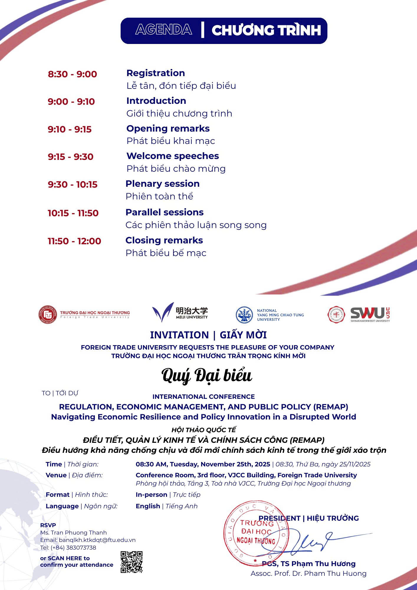Trường Đại học Ngoại thương (đầu mối là Viện Kinh tế và Kinh doanh quốc tế) trân trọng kính mời Quý vị tham dự Hội thảo quốc tế về Điều tiết, Quản lý kinh tế và Chính sách công – Regulation, Economic Management and Public Policy (REMAP) 2025 với chủ đề: