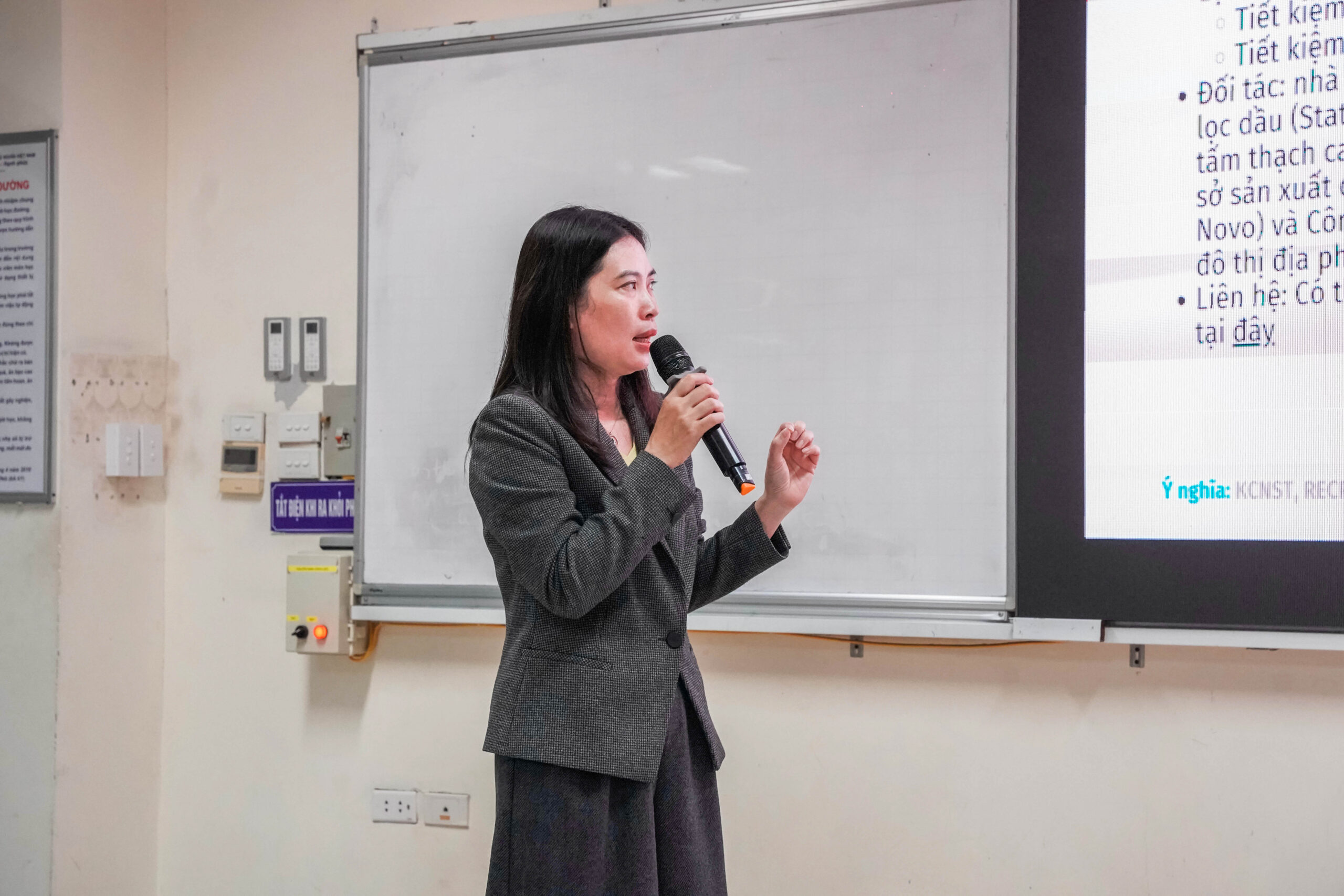 Tiếp nối chương trình, diễn giả đã giới thiệu lộ trình phát triển của mô hình KCN sinh thái tại Việt Nam từ năm 2014 đến nay. Giai đoạn 2014-2019 đặt nền móng cho sáng kiến KCN sinh thái tại Việt Nam với sự hỗ trợ của GEF, SECO và UNDP, do Bộ Kế hoạch và Đầu tư phối hợp với UNIDO thực hiện. Tiếp đó, giai đoạn 2020-2024, Việt Nam tham gia chương trình KCN Sinh thái toàn cầu (GEIPP) nhằm hỗ trợ xây dựng chính sách và nâng cao năng lực thúc đẩy chuyển đổi các KCN theo hướng sinh thái. Hiện nay, dự án đang bước sang giai đoạn II (2024-2028) với mục tiêu nhân rộng các phương pháp  KCN sinh thái, thúc dẩy kinh tế tuần hoàn tại Việt Nam với sự hỗ trợ của Chính phủ Thuỵ Sĩ thông qua SECO, UNIDO và Bộ Tài chính phối hợp triển khai. Phần trình bày cũng cho thấy những kết quả của dự án đã góp phần quan trọng trong việc hình thành khung chính sách và định hướng phát triển KCN sinh thái tại Việt Nam. . Bên cạnh đó, diễn giả cũng chia sẻ một số ví dụ thực tiễn và mô hình tiêu biểu như trường hợp Khu công nghiệp Kalundborg, Đan Mạch và chiến lược phát triển Khu công nghiệp Sinh thái của Hàn Quốc, qua đó giúp sinh viên hiểu rõ hơn cách thức các khu công nghiệp có thể tối ưu hóa nguồn lực, tái sử dụng chất thải và nâng cao hiệu quả kinh tế – môi trường trong quá trình vận hành thông qua cộng sinh công nghiệp.