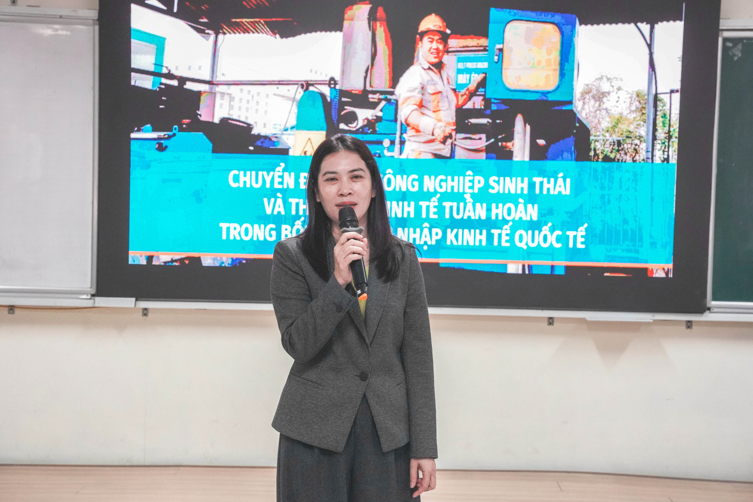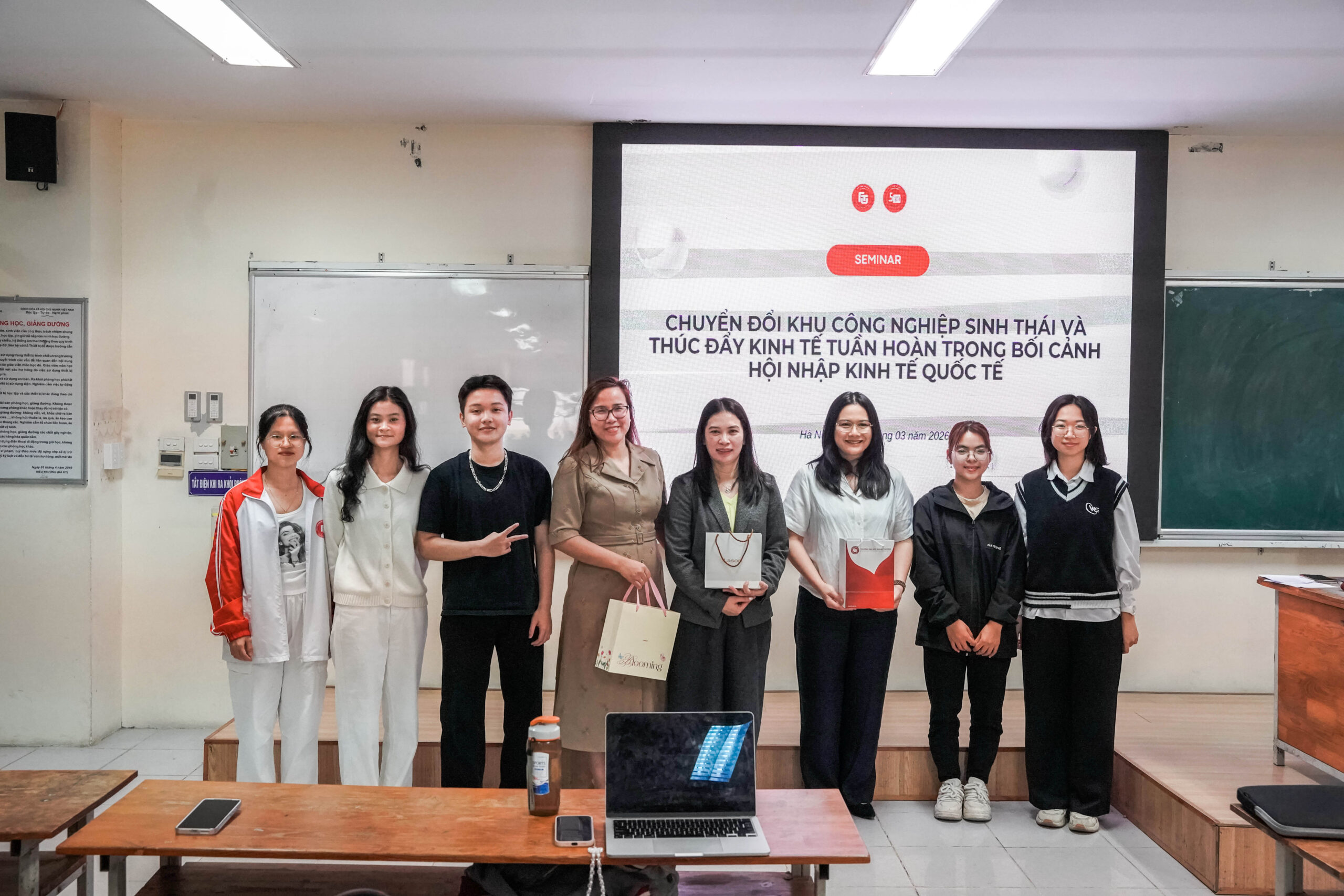 Sáng ngày 05/03/2026, tại Phòng A305 – Trường Đại học Ngoại thương, buổi seminar chủ đề “Chuyển đổi khu công nghiệp sinh thái và thúc đẩy kinh tế tuần hoàn trong bối cảnh hội nhập kinh tế quốc tế” đã diễn ra trong không khí trao đổi học thuật và thông tin sôi nổi. Chương trình được tổ chức trong khuôn khổ học phần Đầu tư quốc tế do TS. Cao Thị Hồng Vinh – giảng viên Viện Kinh tế và Kinh doanh quốc tế phụ trách với sự tham dự của đông đảo sinh viên đang theo học, cùng khách mời là TS Nguyễn Trâm Anh, Quản lý Quốc gia, Dự án “Nhân rộng phương pháp tiếp cận Khu công nghiệp sinh thái để thúc đẩy kinh tế tuần hoàn tại Việt Nam” do Chính phủ Thụy Sĩ (SECO) tài trợ, Bộ Tài chính và Tổ chức Phát triển Công nghiệp Liên Hợp Quốc (UNIDO) triển khai .