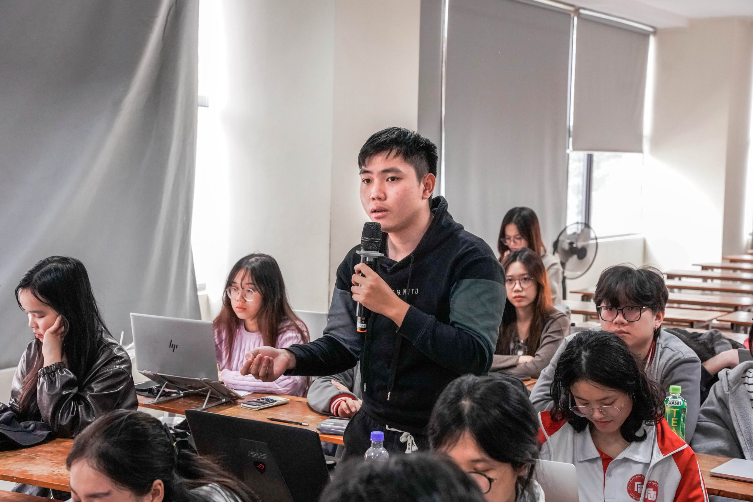 Phần trao đổi và thảo luận đã diễn ra sôi nổi với nhiều câu hỏi từ sinh viên xoay quanh các vấn đề như vai trò của khu công nghiệp sinh thái trong thu hút đầu tư quốc tế, lợi thế và thách thức đối với việc thiết lập mối liên hệ cộng sinh công nghiệp giữa các doanh nghiệp, cũng như việc phương án hạn chế nguy cơ về hiện tượng “tẩy xanh” (greenwashing) nhằm đảm bảo tính hiệu quả thực chất trong quá trình chuyển đổi sinh thái của các khu công nghiệp. Diễn giả đã trực tiếp giải đáp và chia sẻ nhiều góc nhìn thực tiễn, giúp sinh viên hiểu rõ hơn về chiến lược phát triển Khu công nghiệp sinh thái và thúc đẩy Kinh tế tuần hoàn trong bối cảnh hội nhập kinh tế quốc tế. Qua đó, sinh viên không chỉ được mở rộng hiểu biết về các xu hướng phát triển công nghiệp bền vững, chuyển đổi xanh và kinh tế tuần hoàn, mà còn có cơ hội kết nối những kiến thức trong học phần Đầu tư quốc tế với các vấn đề đang được quan tâm trong thực tiễn quản lý và phát triển khu công nghiệp theo định hướng chuyển đổi kép: chuyển đổi số – chuyển đổi xanh tại Việt Nam.